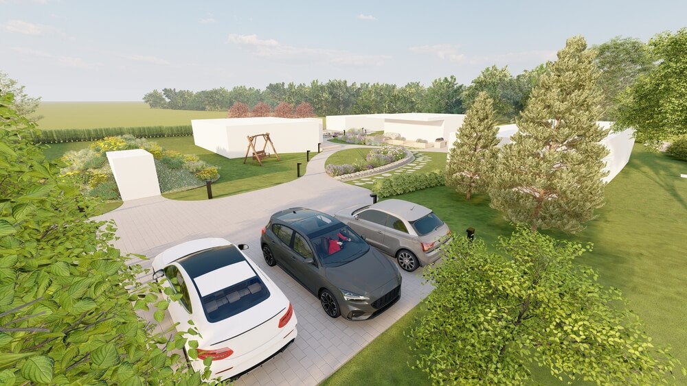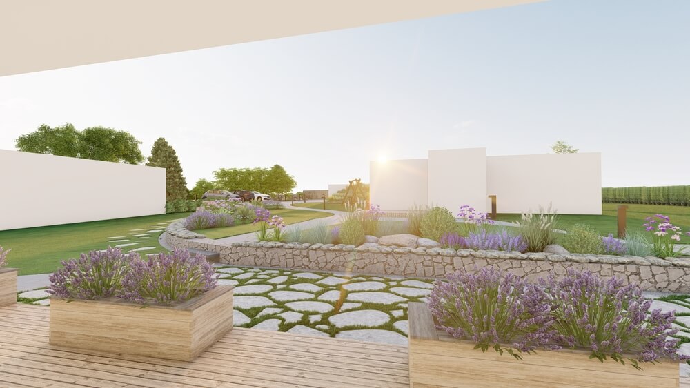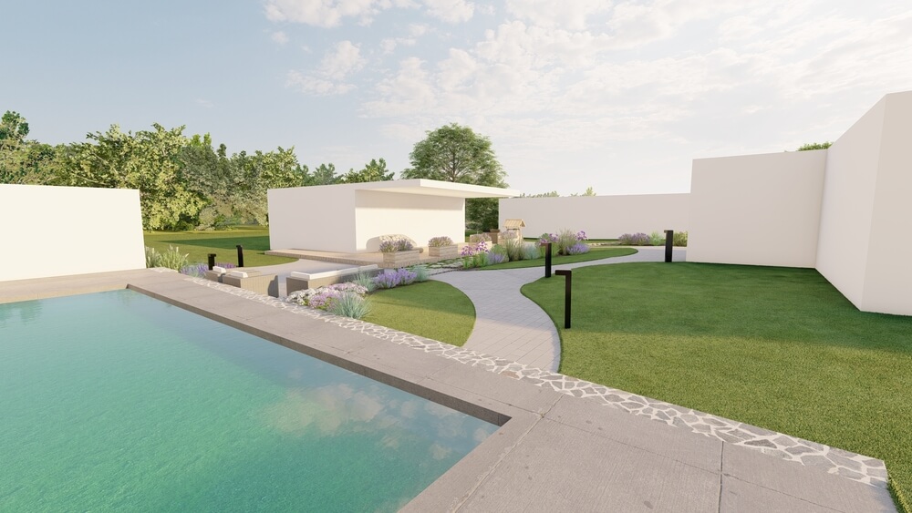 Ala puhul köitis olemasolev reljeefne maastik, mida oli kombineeritud laotud maakivimüüriga. Projekteerimise käigus toodi maakivist laotud müüri rohkem esile ning valgustati. Keeruliselt ligipääsetavad ja hooldatavad pinnad nagu maakeldri katus ja ajutine basseini katte aluspind täideti optimaalset hooldusvajadust vajavate pinnakatte taimedega. Istutusalade taimevalik lähtus lilladest, valgetest ja sinakatest õietoonidest, mille fooniks valiti erinevaid kõrreliste sorte. Alale projekteeriti uusi funktsioone nagu lõkkekoht ja väliköök, mis pikendaks õues viibimise aega.