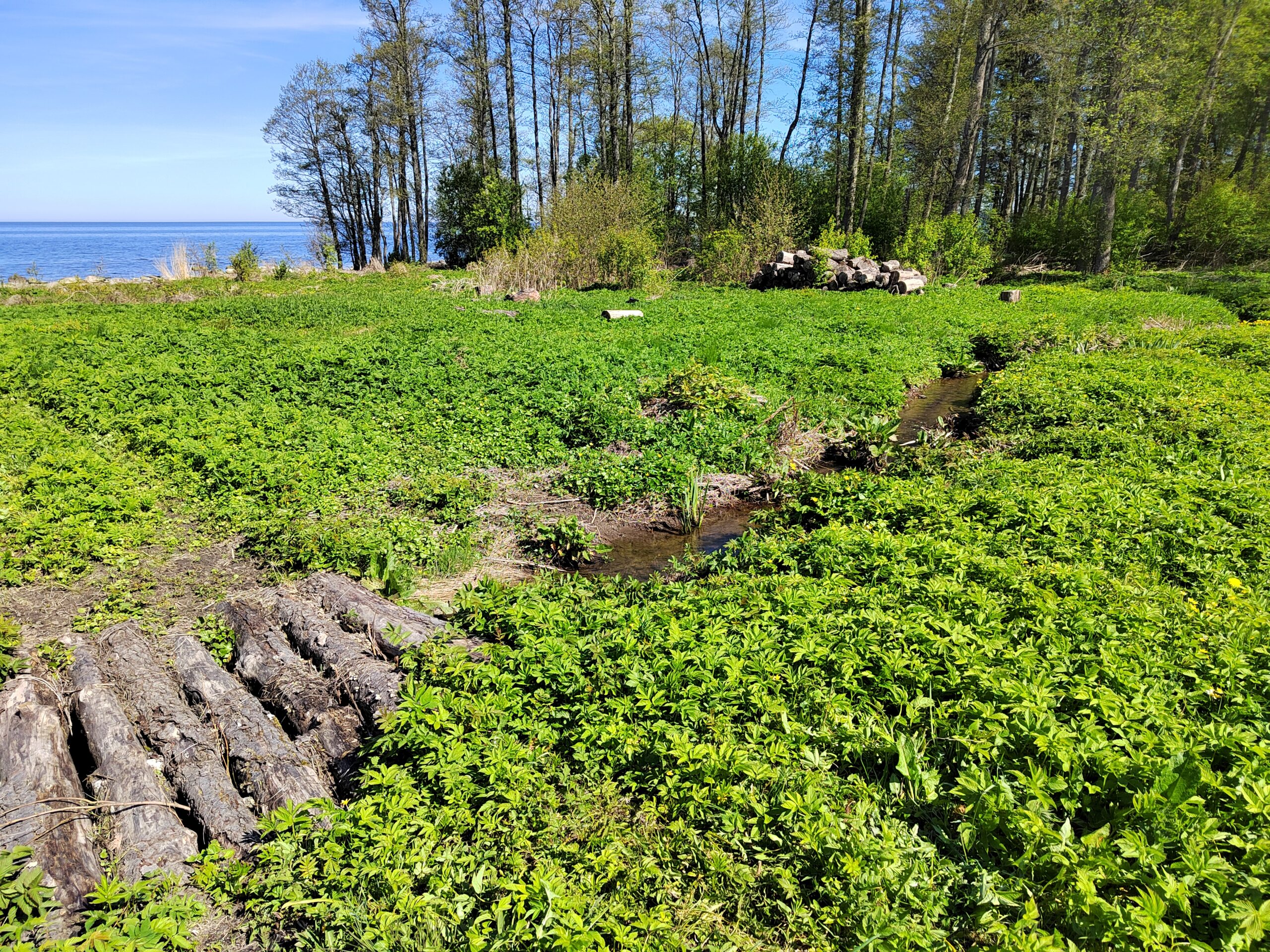 Kinnistul paiknev lagendik andis kontseptsiooniks märksõna vaateaken. Mitmeid korda kinnistut külastades sai kiiresti selgeks, et kinnistu suurimaks väärtuseks on avar merevaade. Maastikulise lahendusega võeti eesmärgiks väärindada merevaadet ning muuta mereni pääs ligipääsetavamaks ja mugavamaks. Selleks projekteeriti mereni pääs kombinatsioonina graniitkivi astekividest ja laudteest. Astekivid sobituvad mererannal lebavate graniidirahnudega ja laudtee oli tarvilik kevad-suvise liigniiskuse ajaks, et pehmet pinnast ei kahjustataks. Kuna teekonna vahele jääb tiigist väljavoolav oja, siis projekteeriti üle oja kulgev puidust purre. Laudtee kulgeb kahes suunas: hoonest otse randa ja teise haruna vanasse lauteri asukohta. Selleks aga tuli projekteerida üle maaparandussüsteemi kuuluva kraavi puidust elegantse joonega sild. Hoovialal paikneva tiigi äärde tuleb saunamaja ning selle juurde projekteerisime terrassi, mis ühendab saunamaja tiigiga. Nii on võimalik terrassil istuda ja saunalistel väikese redeli kaudu tiiki minna.