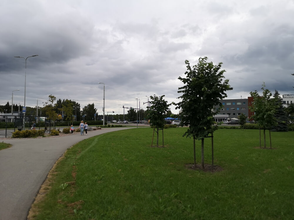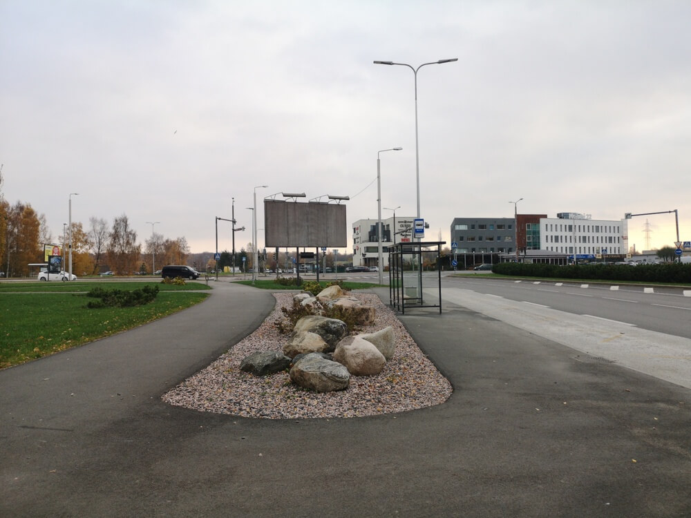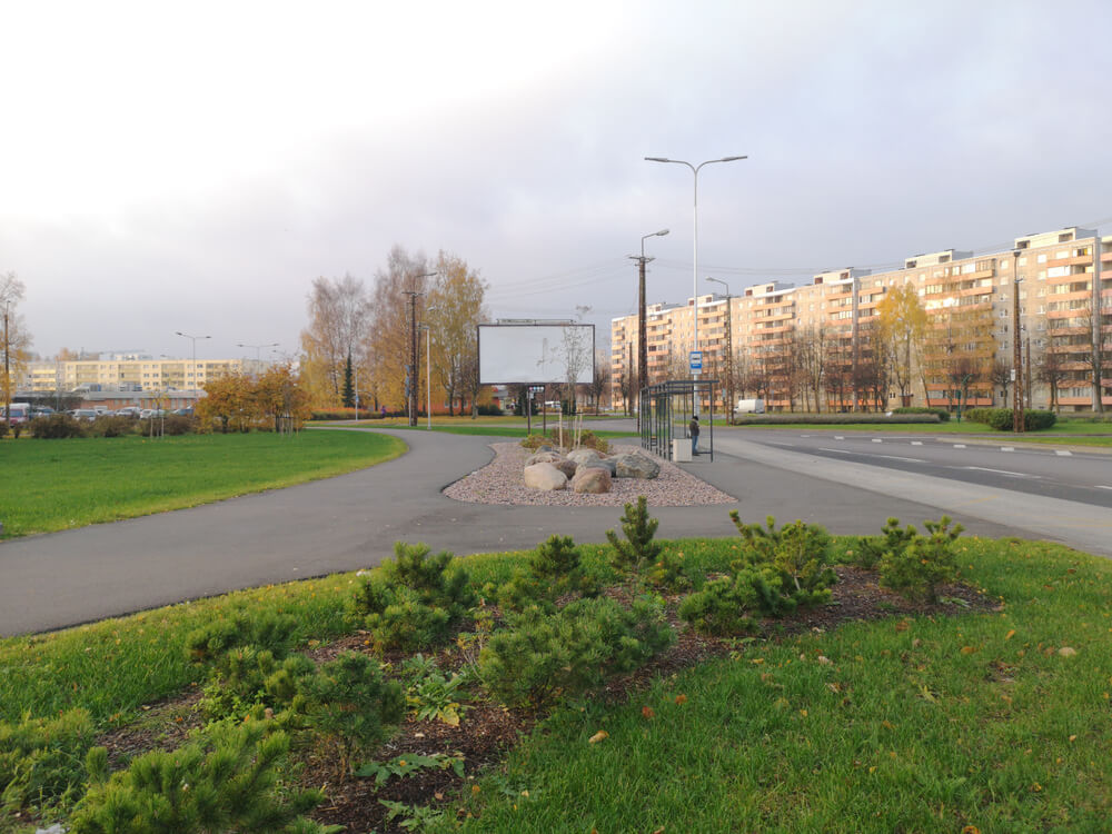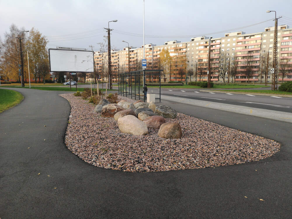 Kontseptsiooniks kujunes lõbus bussiootamine. Haljastuse projekteerimine ühtse haljasala printsiibil oli raskendatud tehnovõrkude paiknemise tõttu, kuna ülisuure läbimõõduga veesüsteemil oli mitme meetrise ulatusega kaitsevöönd. Haljasalade ühtsuse saavutamiseks kombineeriti istutusaladesse suuri maakive ja kasutati suurefrakstioonilist graniitkillustikku. Maakivid pakuvad soojal hooajal istumis- ja turnimisvõimalusi bussioote ajaks ning sellest kasvaski lõbusa bussiootuse idee.